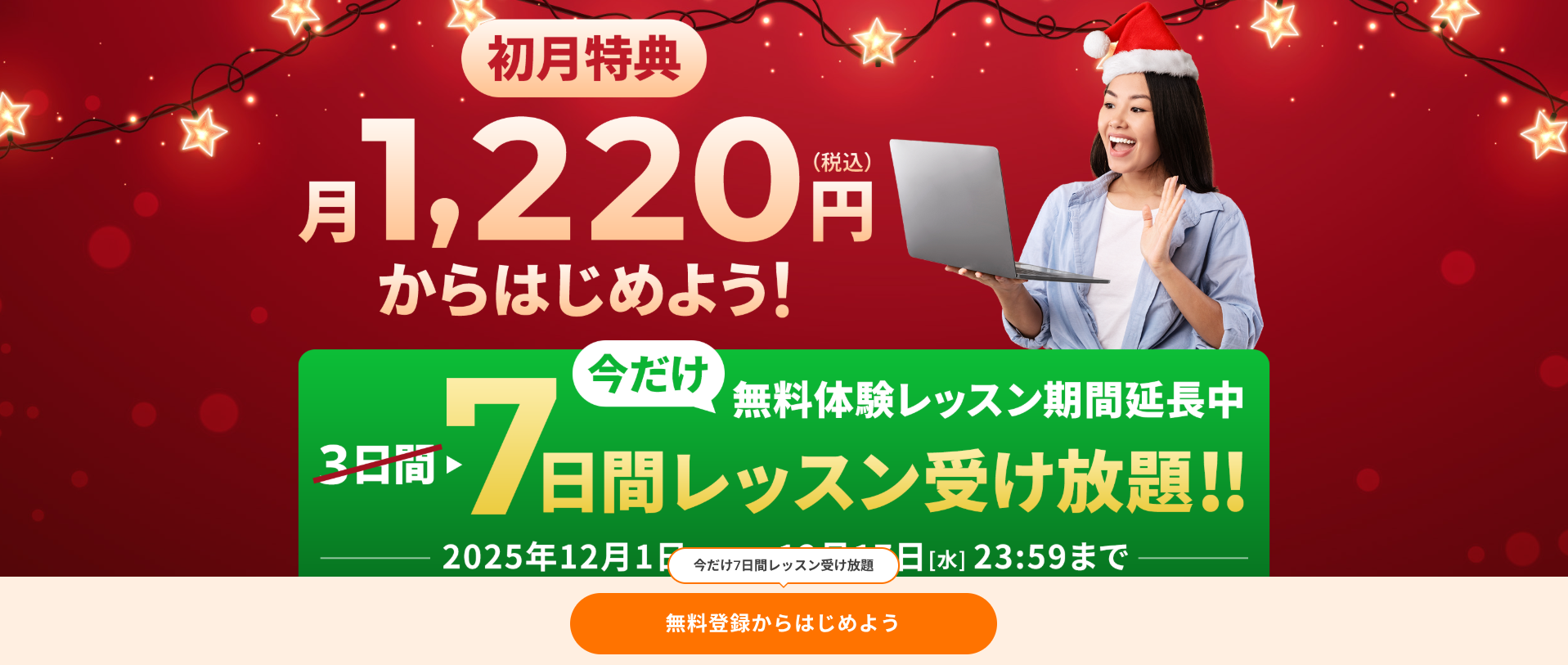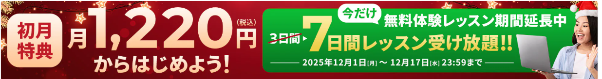 | 無料体験 | 10日間(※コースによってはレッスン×2回まで) |