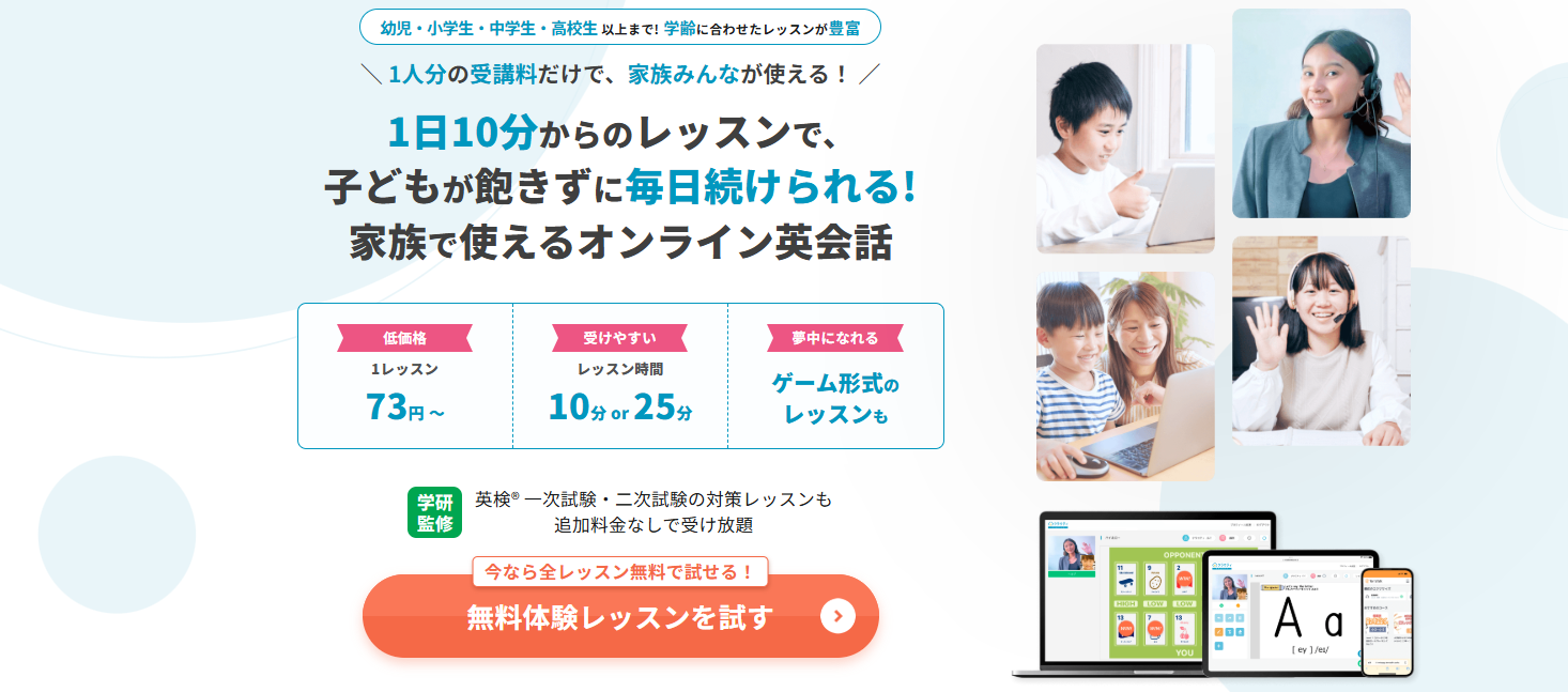 10分から受講できる短時間レッスンは、集中力が続きにくい子どもでも取り組みやすく、毎日少しずつ英語に触れる習慣づくりに向いています。昼間限定のリーズナブルなプランも用意されており、在宅時間を有効活用したい家庭にとっても使いやすいサービスです。