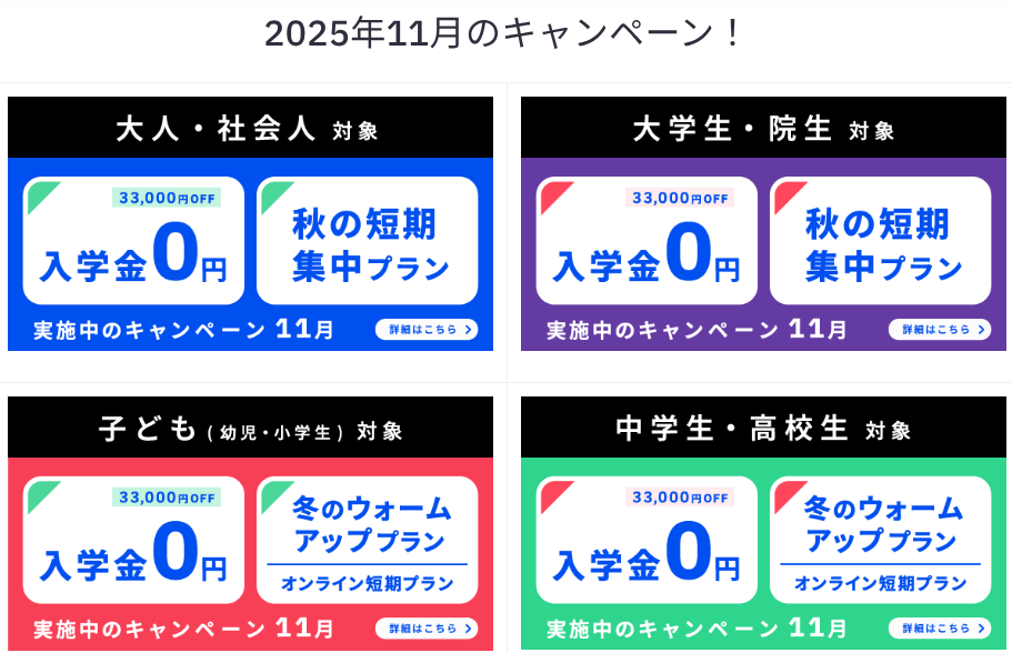 さらに登録した月は受講料が半額になるキャンペーンが行われている(※2025年11月3日現在)ので、この機会に体験してみてはいかがでしょうか。