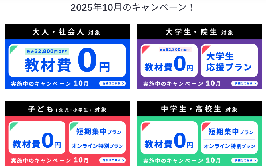 さらに登録した月は受講料が半額になるキャンペーンが行われている(※2025年10月5日現在)ので、この機会に体験してみてはいかがでしょうか。