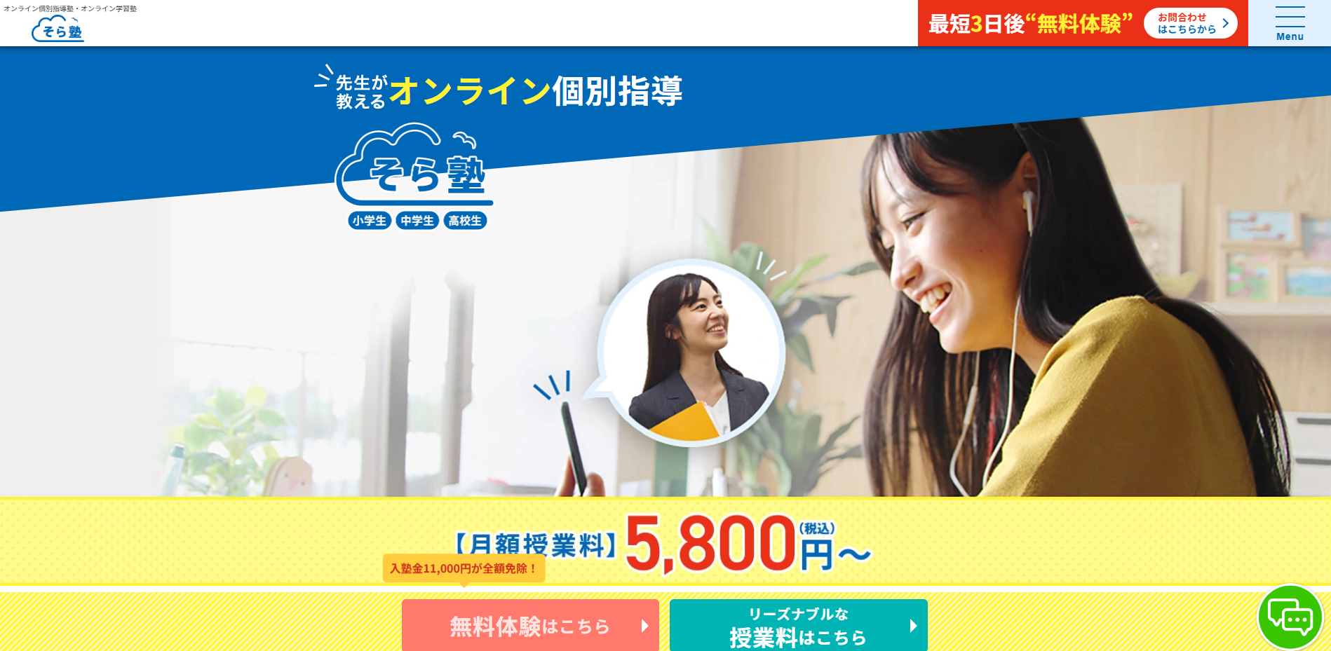 ・定期テスト対策ガイドの プレゼント ・最大5回の授業を無料体験 ・無料体験後の入塾で 入塾金11,000円が無料 |