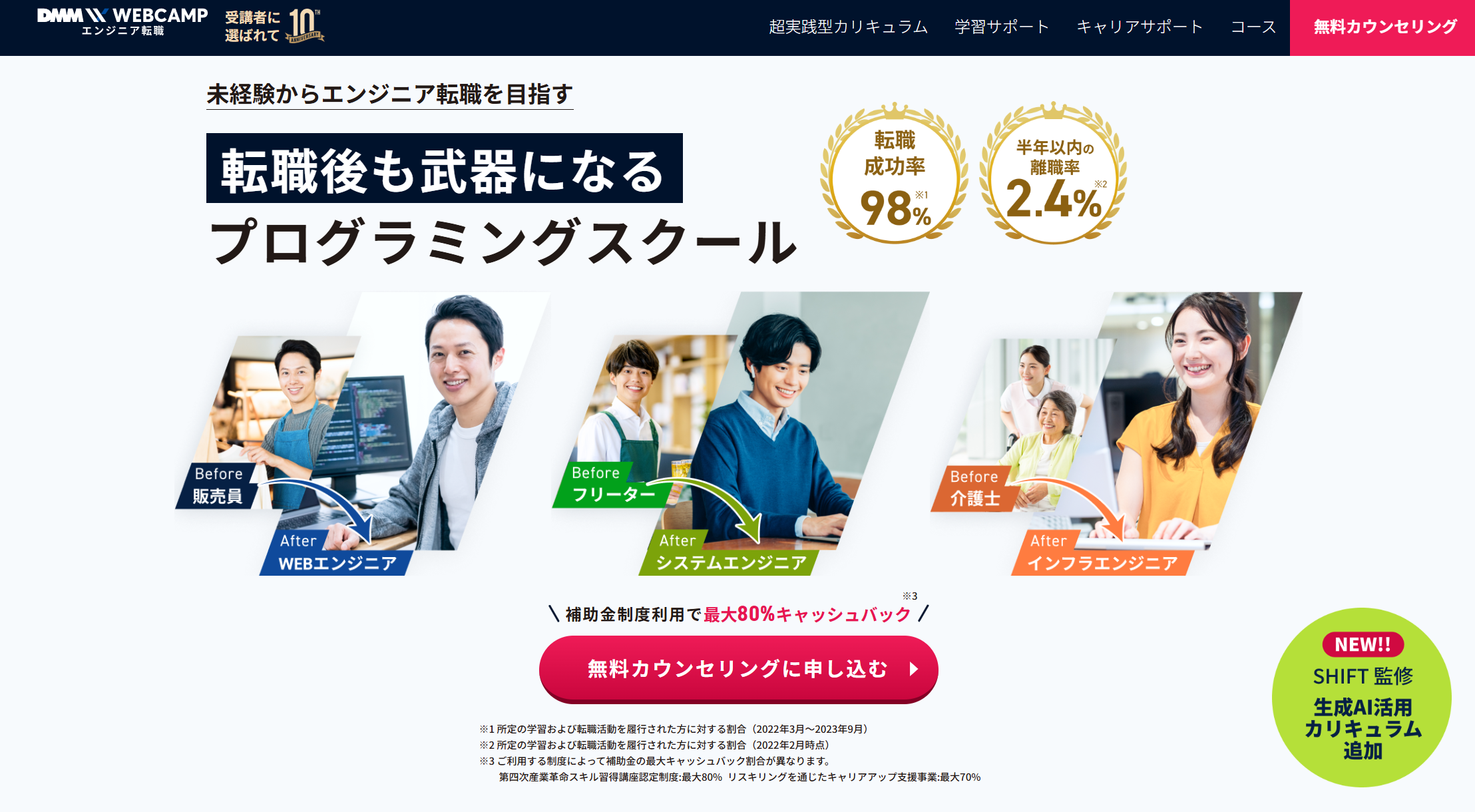 DMM WEBCAMPでは、プログラミング初心者が最短でエンジニア転職を目指すための環境やカリキュラムが整っています。
