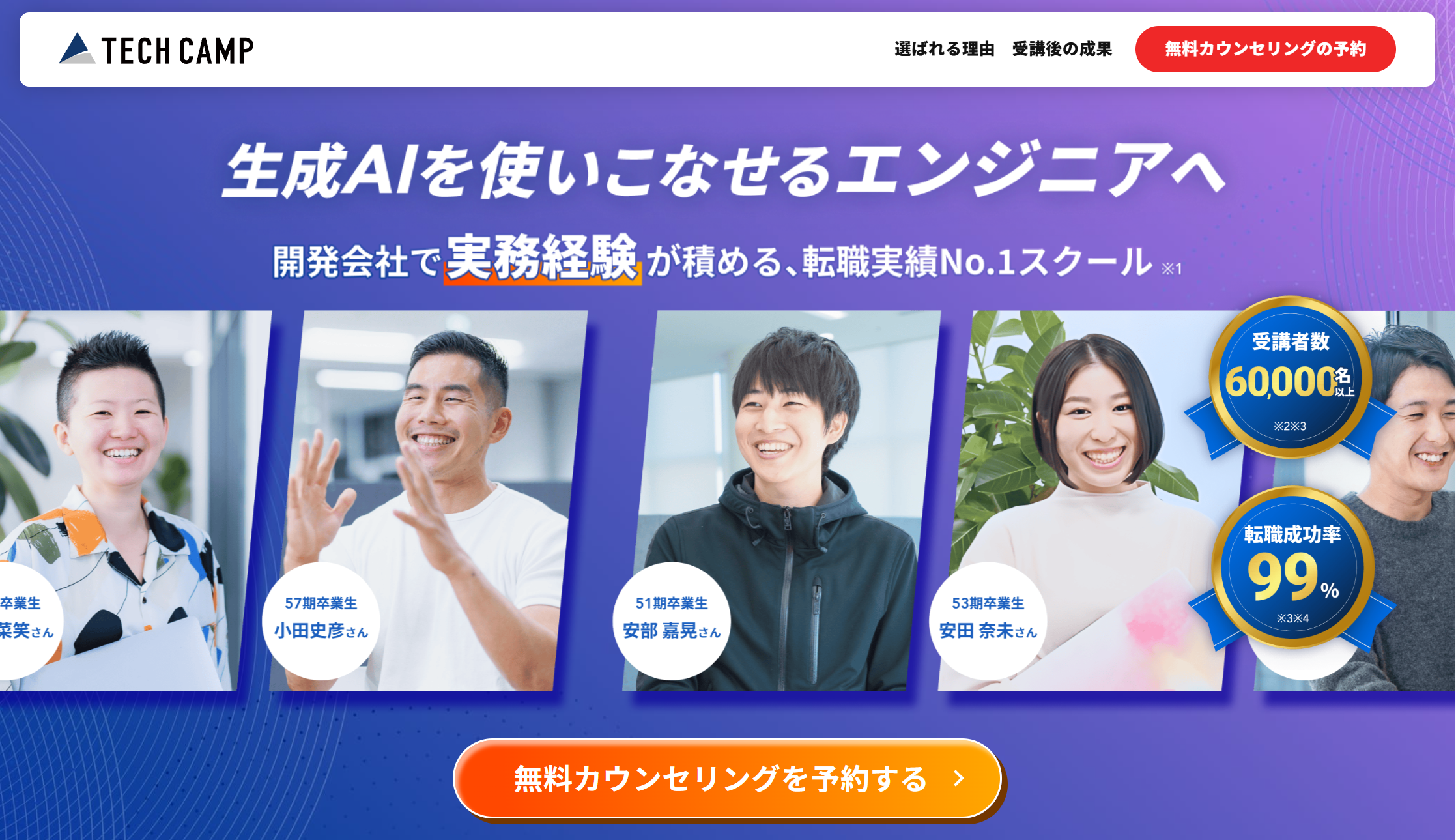 「キャリアサポート満足度の高いプログラミングスクール」3年連続No.1を獲得し、関連会社がエンジニア転職・独立を支援するサービスを実施していて、他のスクールにはない手厚い支援が魅力です。