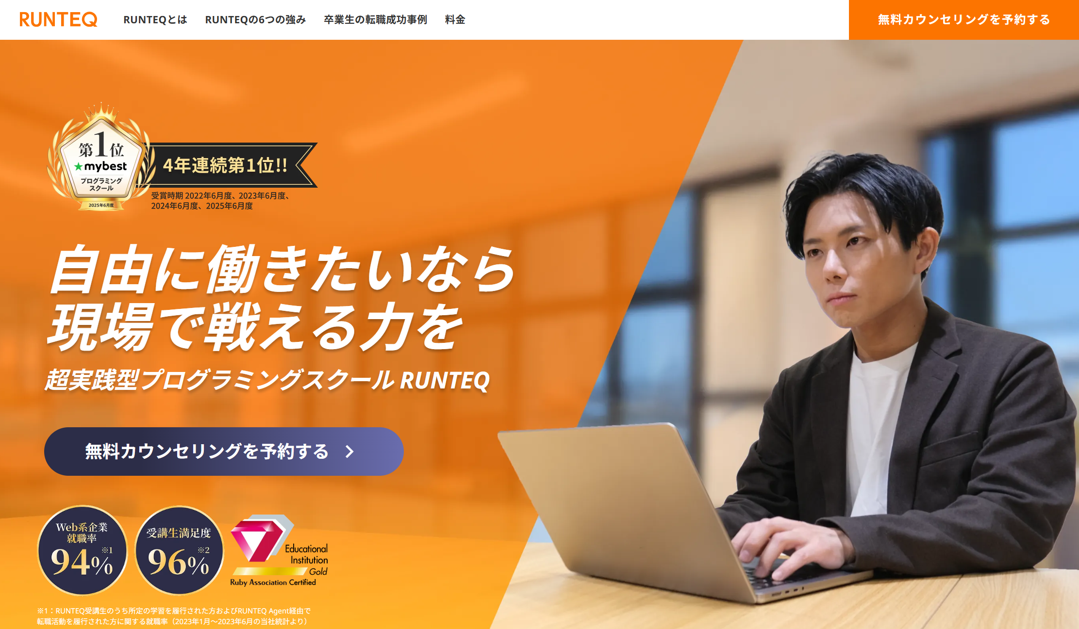 | 価格帯(税込) | Railsキャリアコース:440,000円~160,000円(キャリアアップ支援適用後) ビジネスAIコース:96,800円 Webサイト制作コース:無料 |